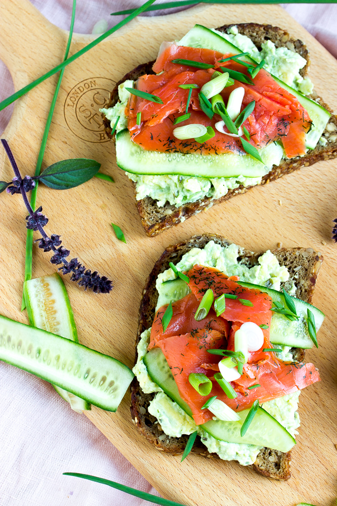 Avocadoaufstrich auf dem Brot verteilen, gehobelte Gurken darauf geben und mit dem Lachs belegen. Mit kleingeschnittener Frühlingszwiebel und etwas Schnittlauch toppen und servieren.