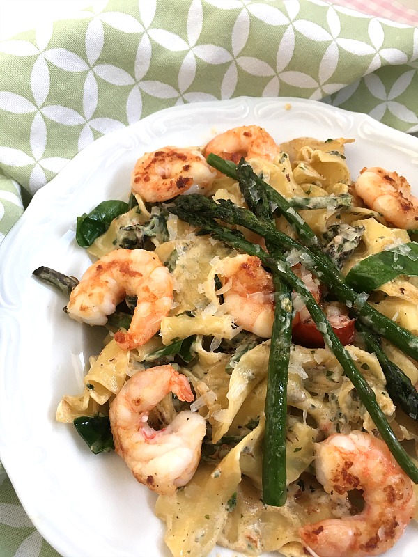 Ich habe den Spargel diesmal mit Garnelen,Tomaten und Frühlingszwiebeln in einer Frischkäsesauce gemacht und Bandnudeln dazu gereicht. In 20min hatten wir ein super leckeres Essen auf dem Tisch!
