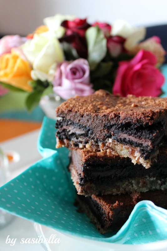 | Oreos nebeneinander auf den Cookie-Teig legen. Brownieteig darauf verteilen und glatt streichen. Im heißen Ofen 30–35 Minuten backen. |
